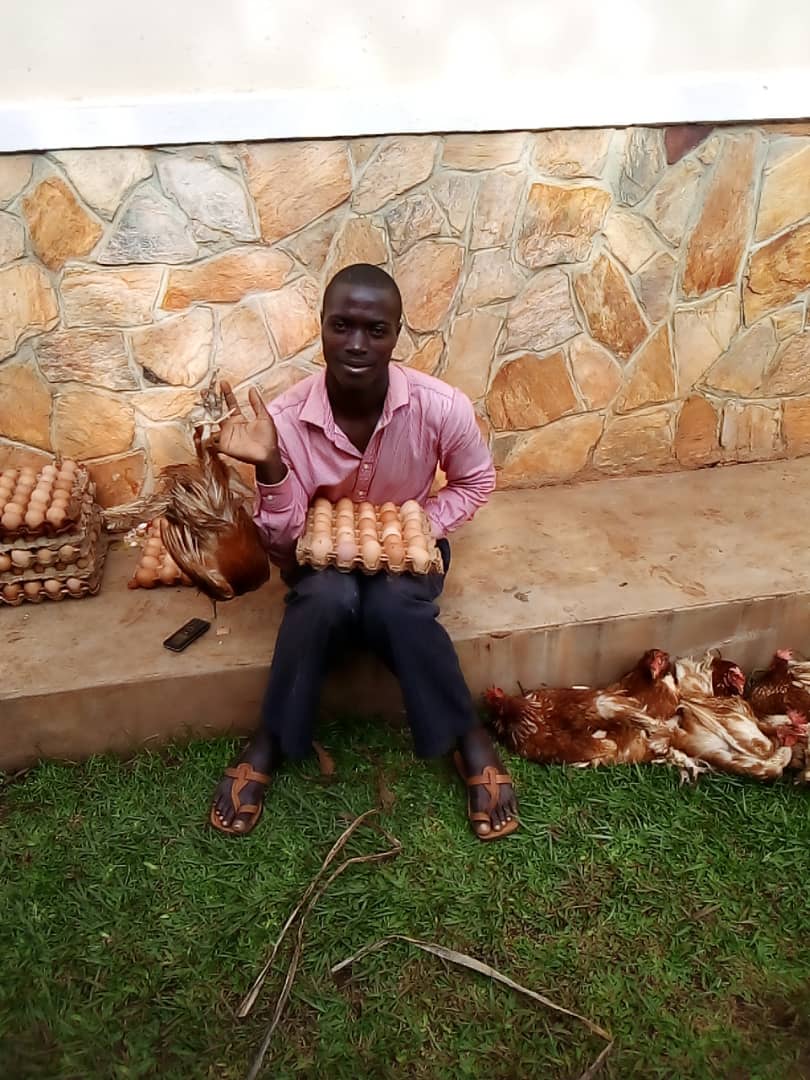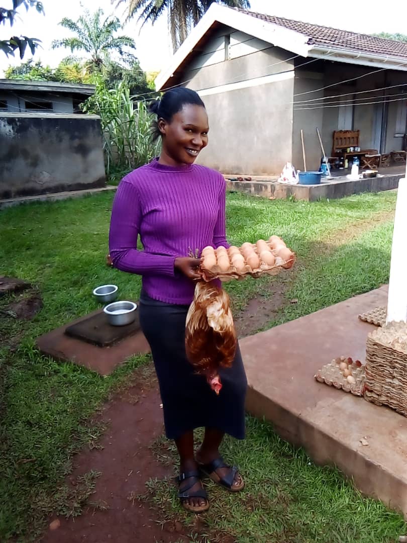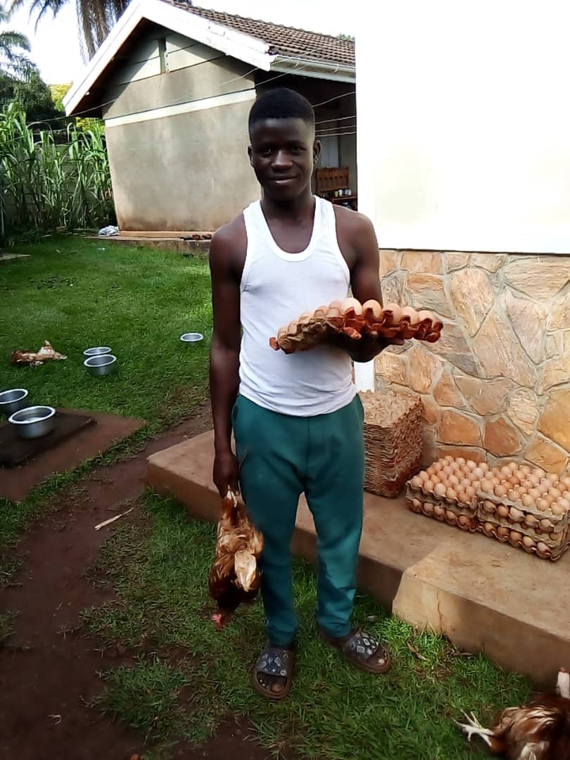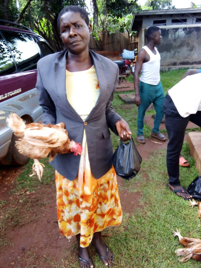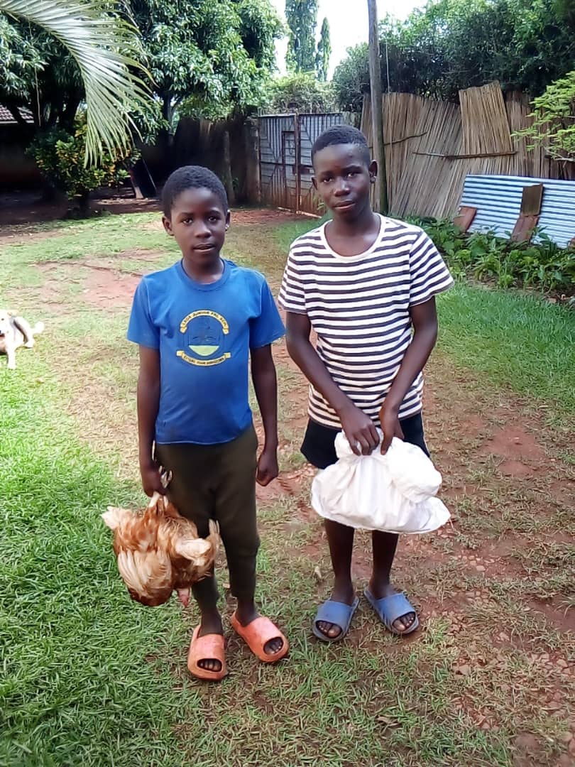Sowohl die Eier als auch die Hühner stammen von Stevies Hühnerfarm, die er bereits 2017 mit finanzieller Unterstützung des Vereins in seinem Dorf aufgebaut hat und seitdem erfolgreich betreibt. Mit dem Moped hat Stevie alle Hühner und Eier über größtenteils unbefestigte Wege zu unserem ca. 30 Kilometer entfernten Odissa-Charles-Haus transportiert. Dort konnten die Familien ihre Überraschung abholen. Die weiter entfernten Haushalte wurden mit dem Vereinsauto beliefert. Dabei half Fred, ein langjähriger Security Guard der Organisation Birungi. Freds Führerscheinprüfung wurde als Zusatzqualifikation vom Verein ermöglicht. Seitdem ist er zuverlässig und umsichtig für den Transport von Menschen und Material im Einsatz.